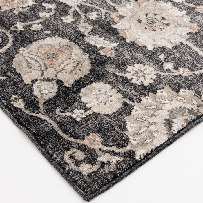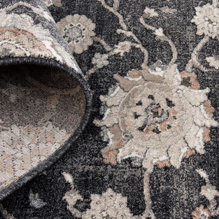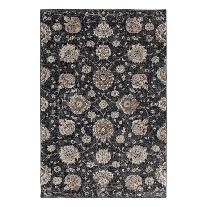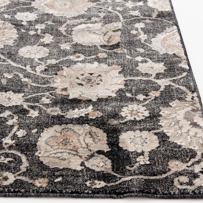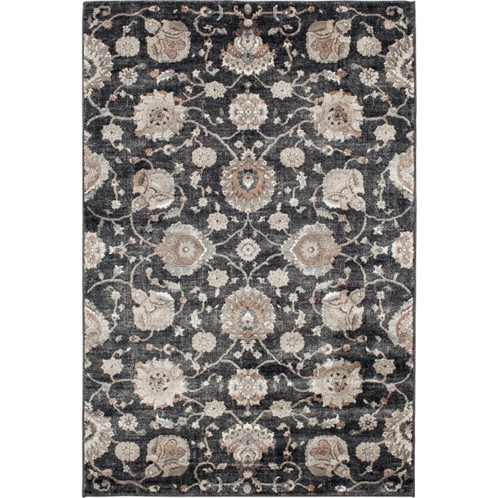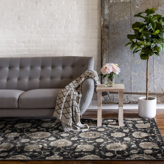 Floral elements twist along vines of medallion designs in a welcoming palette that naturally invites relaxation in your den, dining area, or bedroom. The symmetric design features light gray tones with light brown accent colors swirling across a deep navy blue background that makes the lighter colors stand out spectacularly. From rustic to modern farmhouse, this elegant design fits right in with a variety of home decor styles to easily elevate the look of your space. Guests will delight in the luxurious softness of this area rug, and you’ll love how easy it is to maintain. Each rug is machine made with state-of-the-art, computer-driven looms and built to last. Feel free to place this floor covering front and center in your home with no fear of fading or staining – soft polypropylene yarns create a low profile pile that’s stain resistant, maintains appearance, and is easy to clean. For indoor use. Made in the USA.