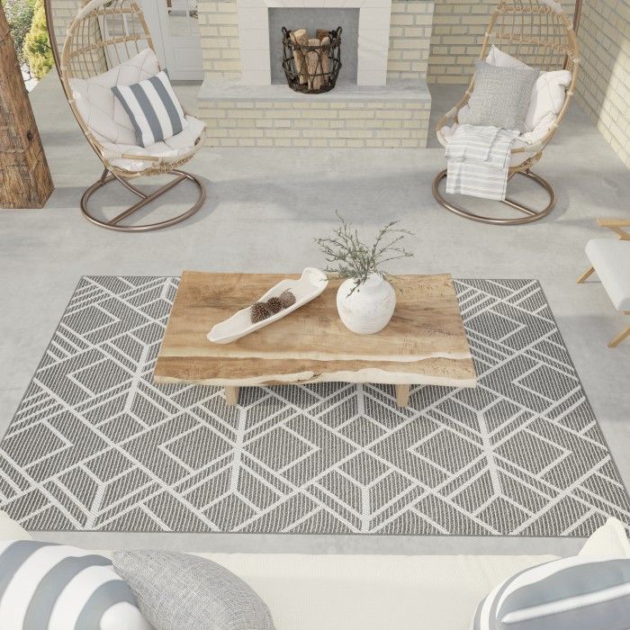- • Stain Resistant• Fade Resistant• Machine made with Polypropylene Yarn.• Gray/Cream Geometric Pattern with Fibrillated backing.• 0.24 in Pile Height Covering 12.92 Square Feet• Durable construction is perfect for high-traffic areas• Lightweight and stain-resistant. Easy to clean and maintain, we recommend vacuuming regularly or spraying with a garden hose. Always test a small area first.