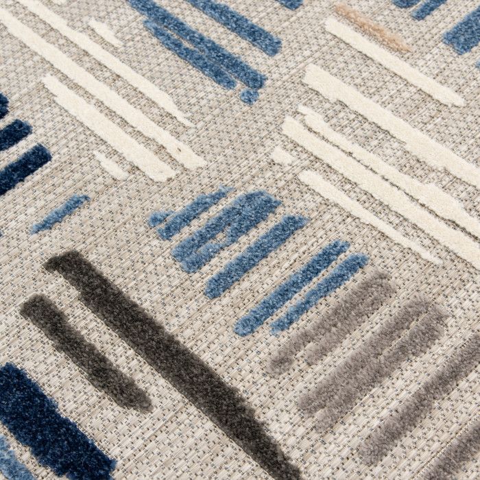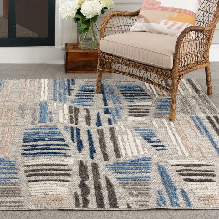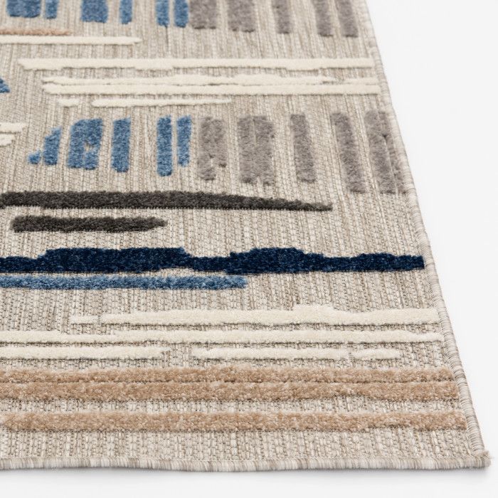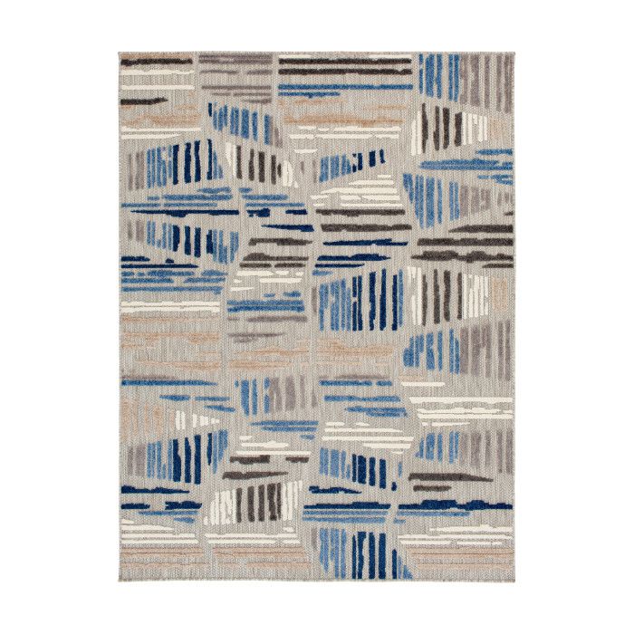 Exceptional durability meets modern abstract design in this versatile area rug, making it the perfect piece to upgrade your patio, kitchen, or sunroom. A versatile, contemporary palette of navy blue, sapphire, slate gray, charcoal, and ivory works seamlessly with a wide range of home decor styles, adding a touch of modern luxury to your indoor or outdoor space. The unique high-low weaving technique creates compelling depth and dimension, adding an extra element of compliment-worthy style to your home. Because these pieces are long-lasting and easy to clean, you can enjoy your favorite space without fear of staining or fading, even in the most high-traffic or spill-prone areas of your home. Each rug is machine made using state-of-the-art, computer-driven looms, and polypropylene yarns create a low profile pile that’s stain resistant and fade resistant. Delight in a modern combination of rich color, surprising comfort, and exceptional durability that fits both your home and your lifestyle effortlessly. For indoor or outdoor use. Imported.