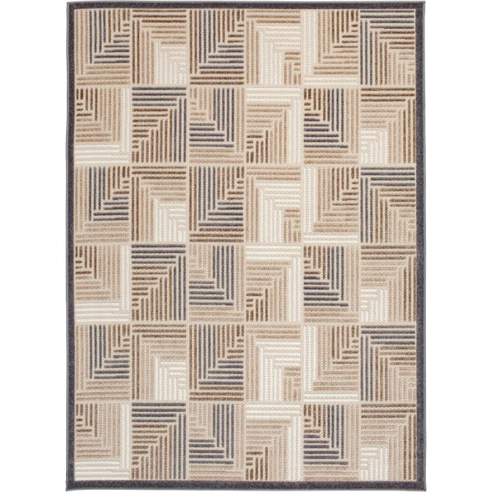 Add depth and dimension to your kitchen, garden, or patio with this beautifully designed and exceptionally durable area rug. Abstract geometric designs in neutral tones of taupe, charcoal, cream, and ivory create a brilliant multidimensional look, and a unique high-low weaving technique adds compelling texture. Whether it’s a quiet spot in the shade or a busy central dining area, this floor covering lets you infuse a bit of low maintenance, high-end design into your home without fear of staining or fading, even in high-traffic and spill-prone areas. These gorgeous floor coverings are fade resistant, stain resistant, and surprisingly comfortable underfoot thanks to soft polypropylene yarns, so you can spend more time enjoying your space and less time on maintenance. Easy to clean and machine made using state-of-the-art, computer-driven looms, these rugs are sure to maintain their exceptional durability and rich design for years to come. For indoor or outdoor use. Imported.