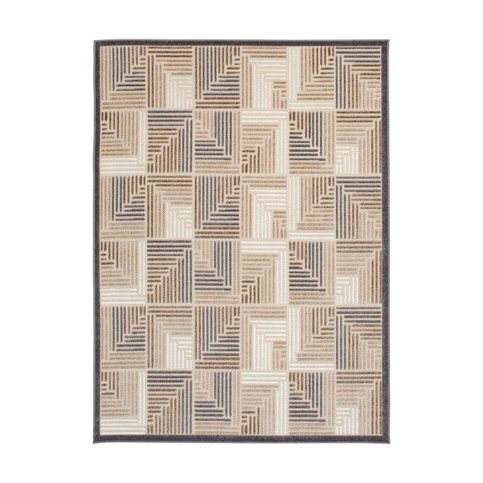 Add depth and dimension to your kitchen, garden, or patio with this beautifully designed and exceptionally durable area rug. Abstract geometric designs in neutral tones of taupe, charcoal, cream, and ivory create a brilliant multidimensional look, and a unique high-low weaving technique adds compelling texture. Whether it’s a quiet spot in the shade or a busy central dining area, this floor covering lets you infuse a bit of low maintenance, high-end design into your home without fear of staining or fading, even in high-traffic and spill-prone areas. These gorgeous floor coverings are fade resistant, stain resistant, and surprisingly comfortable underfoot thanks to soft polypropylene yarns, so you can spend more time enjoying your space and less time on maintenance. Easy to clean and machine made using state-of-the-art, computer-driven looms, these rugs are sure to maintain their exceptional durability and rich design for years to come. For indoor or outdoor use. Imported.