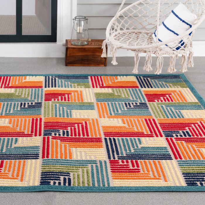 Add depth and dimension to your kitchen, garden, or patio with this beautifully designed and exceptionally durable area rug. Abstract geometric designs in tones of navy blue, sapphire, taupe, charcoal gray, and ivory create a brilliant multidimensional look, and the unique high-low weaving technique adds compelling texture. Whether it’s a quiet spot in the shade or a busy central dining area, this floor covering lets you infuse a bit of low maintenance, high-end design into your home without fear of staining or fading, even in high-traffic and spill-prone areas. These gorgeous floor coverings are fade resistant, stain resistant, and surprisingly comfortable underfoot thanks to soft polypropylene yarns, so you can spend more time enjoying your space and less time on maintenance. Easy to clean and machine made using state-of-the-art, computer-driven looms, these rugs are sure to maintain their exceptional durability and rich design for years to come. For indoor or outdoor use. Imported.