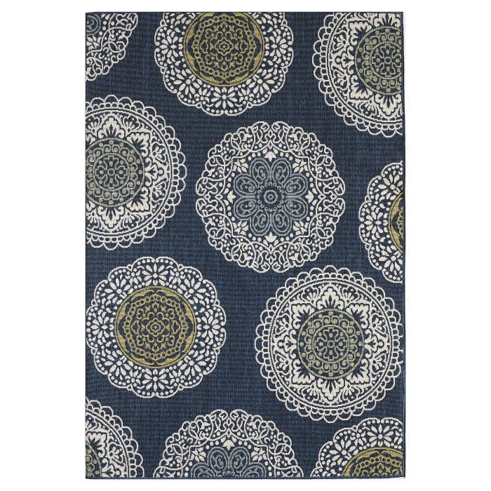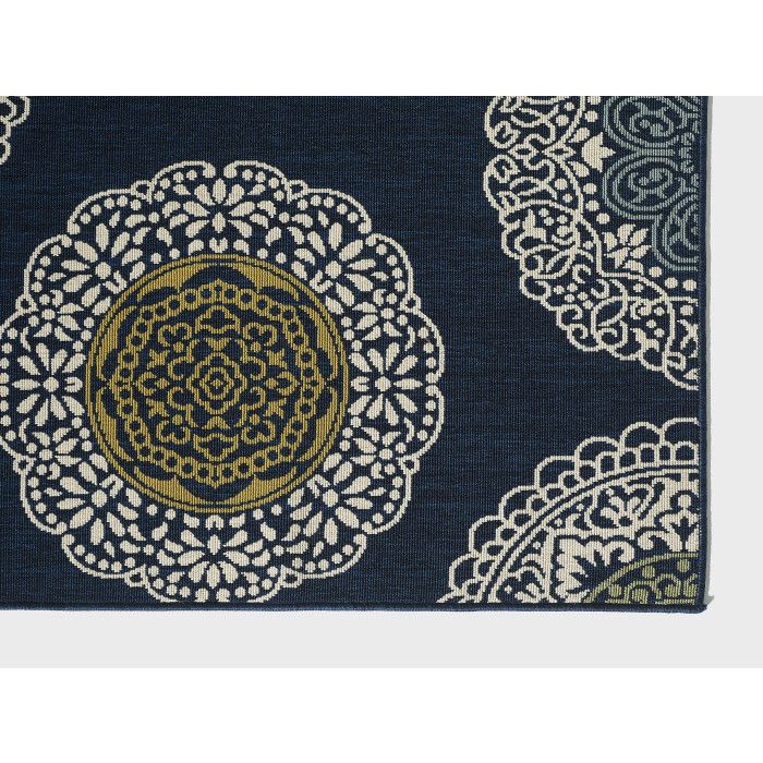 Bring bright color and modern design to your RV, patio, or mudroom, and make any space feel like your own personal oasis. Beautiful floral medallions in vivid ivory, turquoise, lime green, and orange pop against a deep navy background, adding modern style and comfort to any patch of grass, sand, or pavement. Decorate a busy playroom without fear of fading or staining, or make the outdoors feel a bit more like home with this versatile, durable piece. Each rug is flat-woven of quality polypropylene and easy to clean, so you can spend more time enjoying your space and less time worrying about maintenance. Whether you’re packing up your camper for an outdoor adventure or enjoying a sunny picnic in your backyard, the stain resistant and fade resistant properties of this beautiful scatter rug ensure that it will maintain its rich design and exceptional quality for years to come. For indoor or outdoor use. Imported.