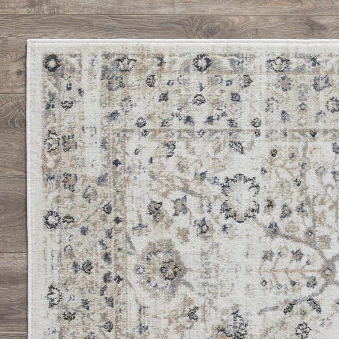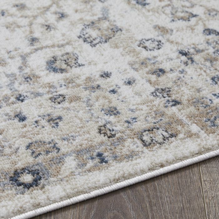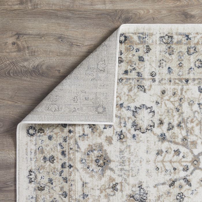 - • Stain Resistant• Fade Resistant• Machine Made With 97% Polypropylene. Jute Backing.• Cream/Blue Oriental Pattern, Covering 77.5 sq. ft.• 0.35 Pile Height Is Perfect For High-Traffic Areas• Durable construction is perfect for high-traffic areas• Lightweight and stain-resistant. Easy to clean and maintain, we recommend vacuuming regularly. Do not use beater bar/rotating brush. For spills, wipe up immediately with a clean, white towel. Spot clean with water or have it professionally cleaned.
