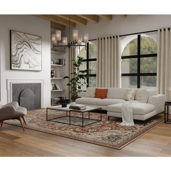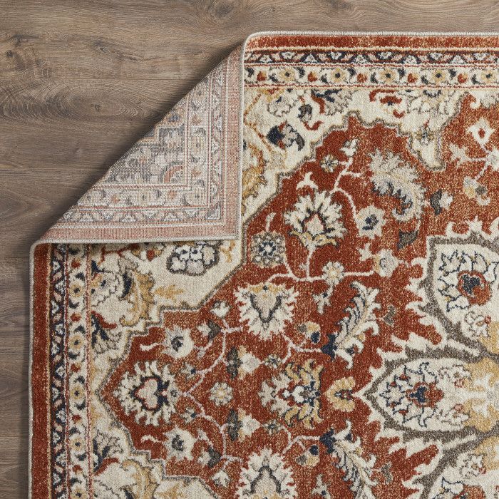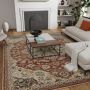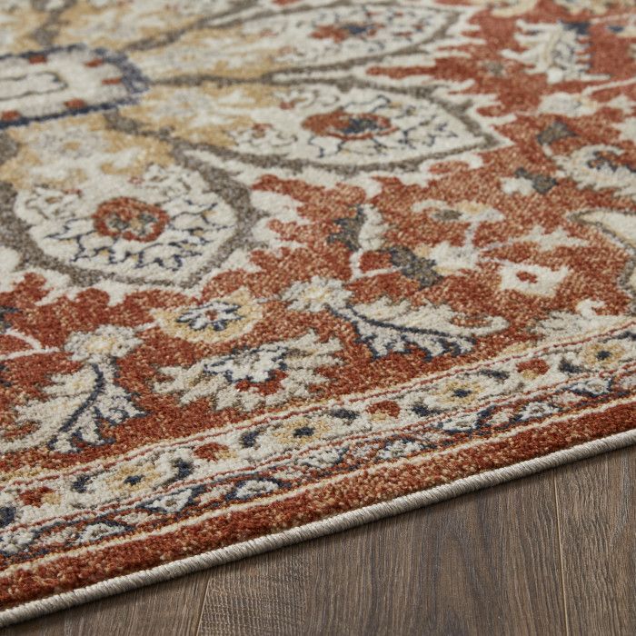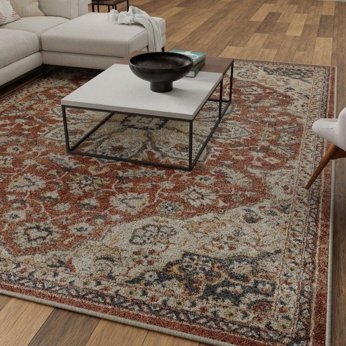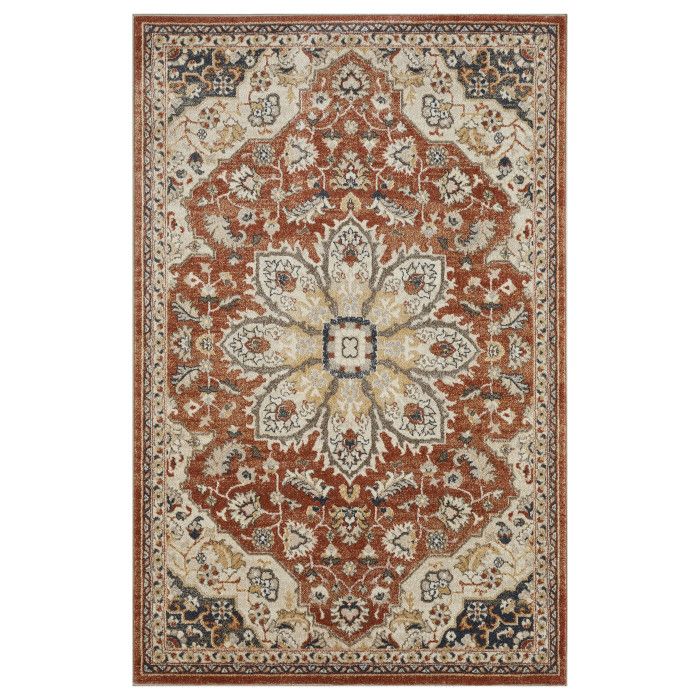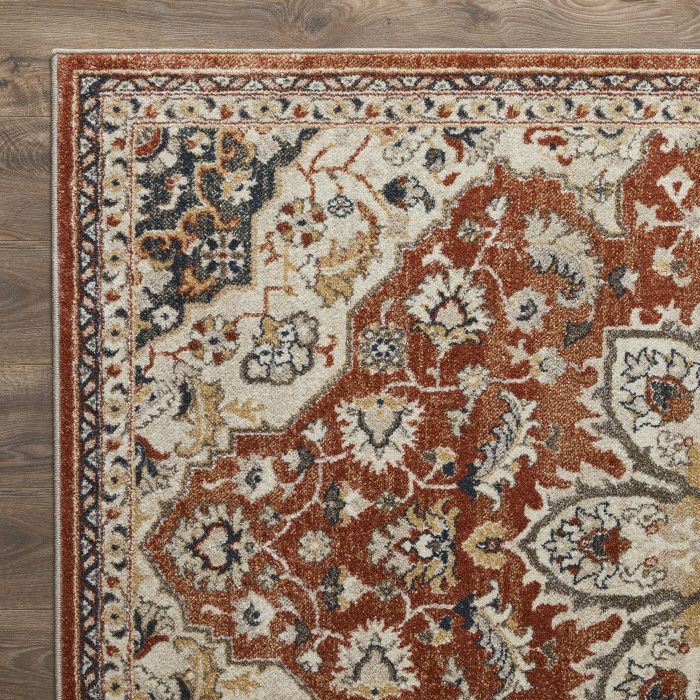 This unique take on the traditional Oriental-style area rug combines rich colors and layers of intricate design to create an elegant, eye-catching foundation for any area of your home. Ornate patterns grace every level of this visually compelling design, leading into the large-scale floral medallion at its center. Each rug is machine made using state-of-the-art, computer-driven looms, and the low profile pile of super-soft polypropylene yarn allows you to enjoy high-end design without sacrificing comfort. Showcase this beautifully woven area rug front and center in a lively living room, tranquil office space, or spill-prone dining area without fear of fading or stains – the durable construction of this piece ensures its long-lasting quality no matter what your life throws at it. Expert construction ensures each piece is stain resistant, maintains its appearance, and is easy to clean, so you can enjoy the look and feel of your rug for years to come.