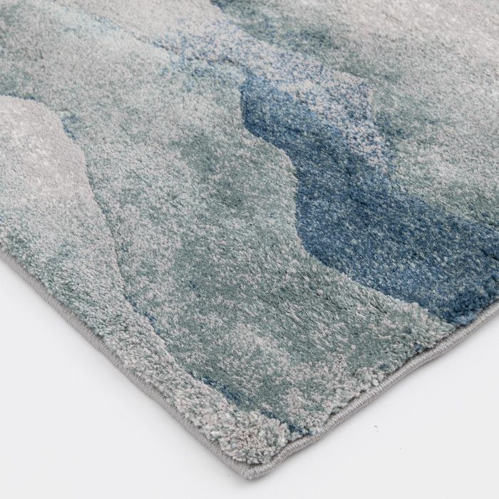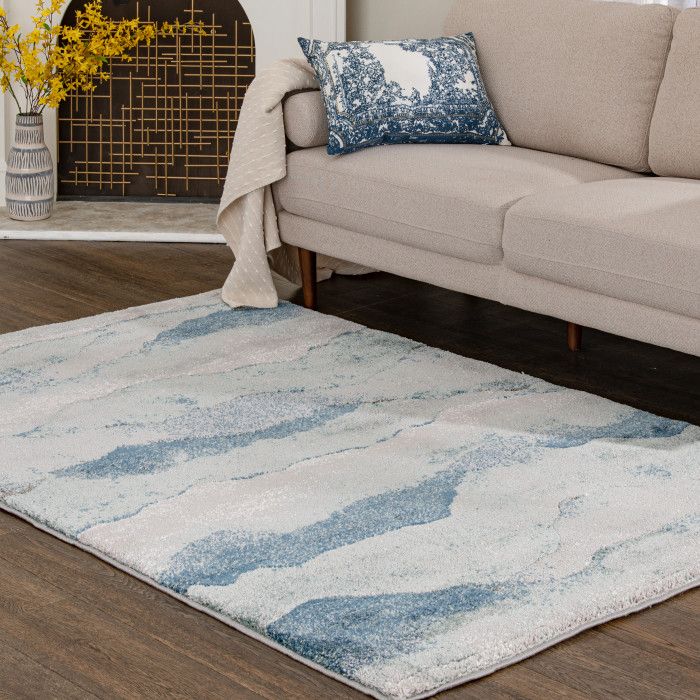 Bring an element of natural artistry to your home – the soft look of this area rug makes a cozy addition to your bedroom, living room, or dining area. The modern palette of blue and cream tones in an abstract design creates a welcoming, contemporary feel that fits perfectly with your home’s unique style of decor. Delight in the plush feeling underfoot every time you step into the room. Each rug is machine made using state-of-the-art, computer-driven looms, and the plush pile of soft polypropylene and polyester yarn allows you to enjoy high-end design without sacrificing comfort or durability. Perfect for a wide range of decor styles, this beautifully woven area rug will do well in any area of your home - even places with high traffic and spill risk. In addition to being easy to clean, the stain resistant and fade resistant properties of this piece ensure that it will maintain its appearance for years to come. For indoor use. Made in the USA.