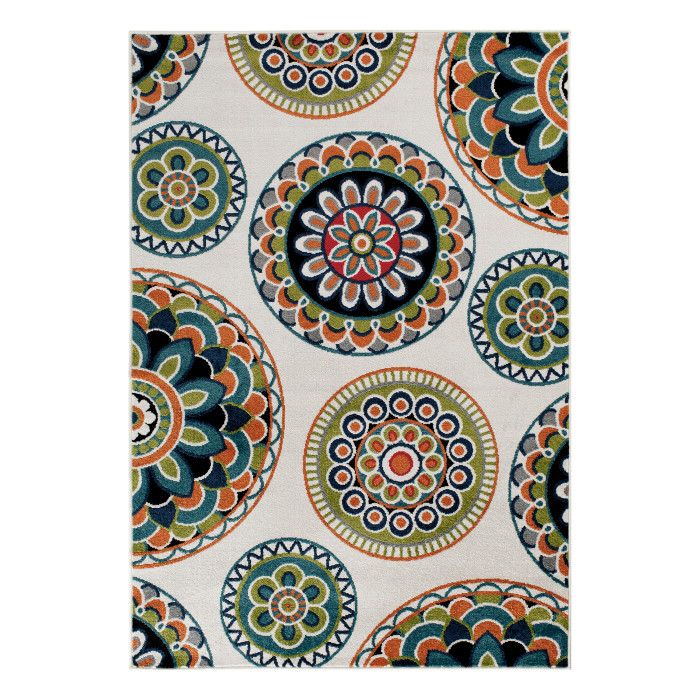 The lively, vibrant colors of this area rug are sure to elevate the style of your favorite space – inside or out! Brighten up your patio space or living room with large scale Mandala-inspired floral designs in a bright palette of lime green, teal, orange, and red that adds that much-needed pop of color for a wide range of home decor styles. This stylish, versatile piece is built to last through whatever mother nature or the nature of your busy household can throw at it, woven of durable polypropylene yarns that still feel comfortable underfoot. Whether it’s a quiet spot in the shade or a central dining area, infuse a bit of fun into your favorite gathering spot without having to worry about staining or fading – these gorgeous floor coverings are easy to clean and machine made using state-of-the-art, computer-driven looms for long-lasting quality. If using this rug outdoors, it is best suited for a covered patio. The fiber used is naturally resistant to mold and mildew, making it perfect for outdoor use; however, please be advised that it will absorb water when exposed to rain. Made in the USA.