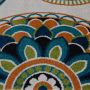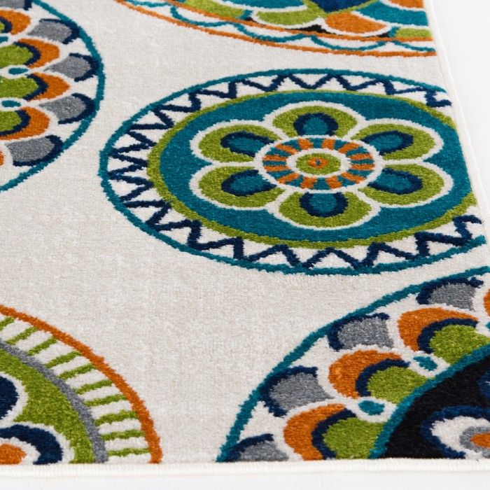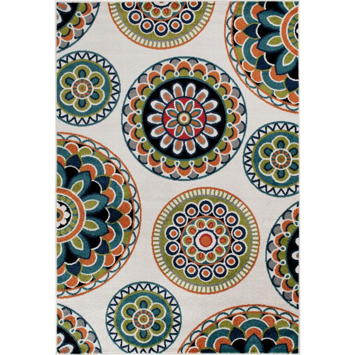 The lively, vibrant colors of this area rug are sure to elevate the style of your favorite space – inside or out! Brighten up your patio space or living room with large scale Mandala-inspired floral designs in a bright palette of lime green, teal, orange, and red that adds that much-needed pop of color for a wide range of home decor styles. This stylish, versatile piece is built to last through whatever mother nature or the nature of your busy household can throw at it, woven of durable polypropylene yarns that still feel comfortable underfoot. Whether it’s a quiet spot in the shade or a central dining area, infuse a bit of fun into your favorite gathering spot without having to worry about staining or fading – these gorgeous floor coverings are easy to clean and machine made using state-of-the-art, computer-driven looms for long-lasting quality. If using this rug outdoors, it is best suited for a covered patio. The fiber used is naturally resistant to mold and mildew, making it perfect for outdoor use; however, please be advised that it will absorb water when exposed to rain. Made in the USA.