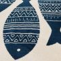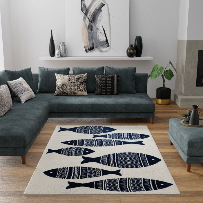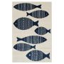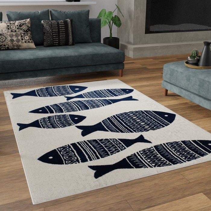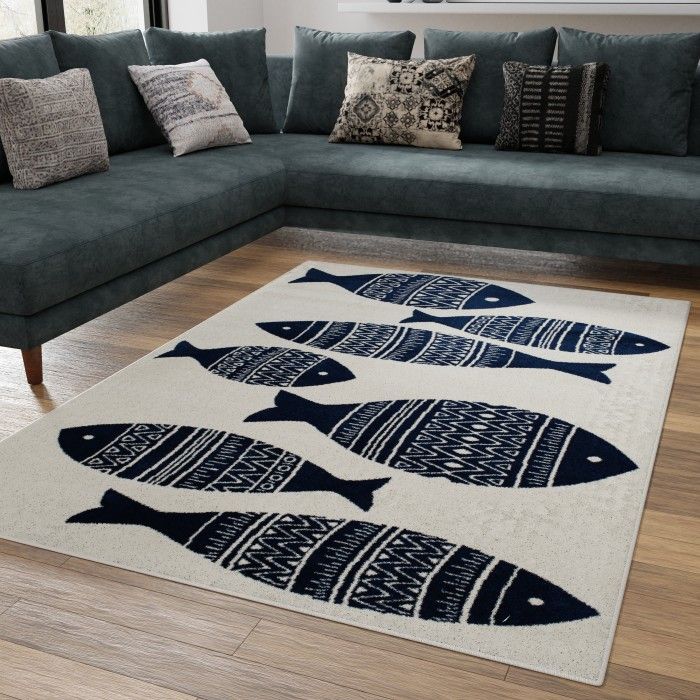Make a splash with this trendy area rug and elevate the style of your patio, bedroom, or dining area. Whimsical fish of varying sizes in deep navy blue with stripes of different geometric white patterns stand out against a soft white background, effortlessly adding modern nautical style to your indoor or outdoor space. The versatile colors allow this beautifully woven rug to fit right in with a wide range of home decor styles, from minimalist to contemporary coastal. Refresh your go-to spot to sip coffee on the deck, or liven up a busy gathering space with a welcoming seaside pattern. Easy to clean and machine made using state-of-the-art, computer-driven looms, this floor covering is built to embody durability and style. Enjoy the comfortable feel of polypropylene yarns in a low profile pile that’s both stain and fade resistant, so you can be sure your rug will look and feel like new for years to come. For indoor or outdoor use. If using this rug outdoors, it is best suited for a covered patio. The fiber used is naturally resistant to mold and mildew, making it perfect for outdoor use; however, please be advised that it will absorb water when exposed to rain. Made in the USA.