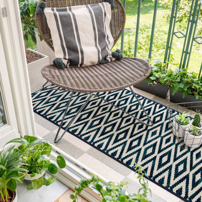 - • Stain Resistant• Fade Resistant• If using this rug outdoors, it is best suited for a covered patio. The fiber used is naturally resistant to mold and mildew, making it perfect for outdoor use; however, please be advised that it will absorb water when exposed to rain.• Machine Made With 100% Polypropylene Yarn.• White/Blue Geometric Pattern covering 16.88 sq ft• 0.28 in Pile Height• Durable construction is perfect for high-traffic areas• Lightweight and stain-resistant. Easy to clean and maintain, we recommend vacuuming regularly or spraying with a garden hose. Always test a small area first.