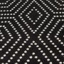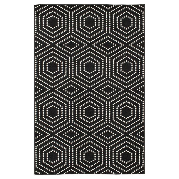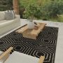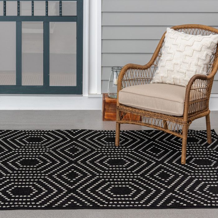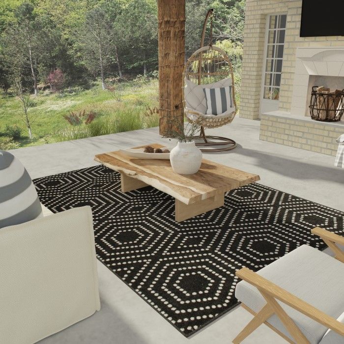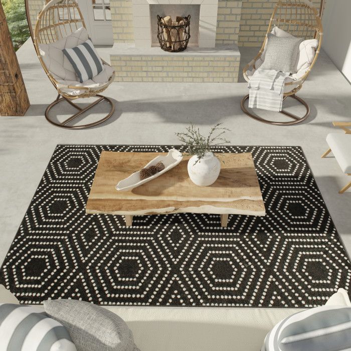 - • Stain Resistant• Fade Resistant• If using this rug outdoors, it is best suited for a covered patio. The fiber used is naturally resistant to mold and mildew, making it perfect for outdoor use; however, please be advised that it will absorb water when exposed to rain.• Machine Made With 100% Polypropylene Yarn.• Black/White Geometric Pattern covering 77.03 sq ft• 0.28 in Pile Height• Durable construction is perfect for high-traffic areas• Lightweight and stain-resistant. Easy to clean and maintain, we recommend vacuuming regularly or spraying with a garden hose. Always test a small area first.